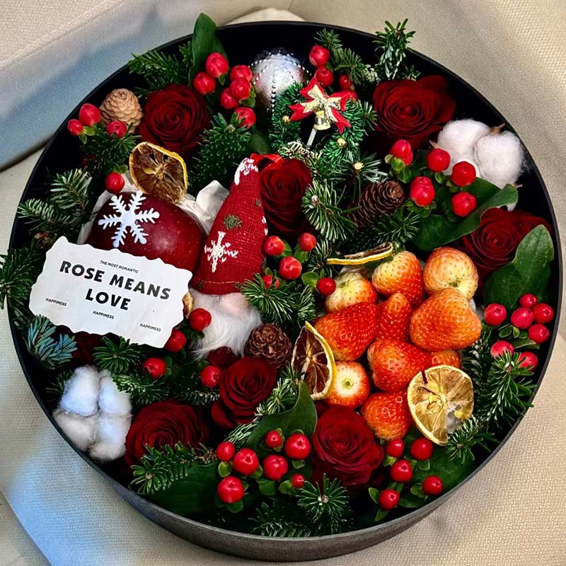8支红玫瑰 10个草莓 1个苹果 2朵棉花 松叶 松果 红豆 圣诞老人 雪花如图装饰