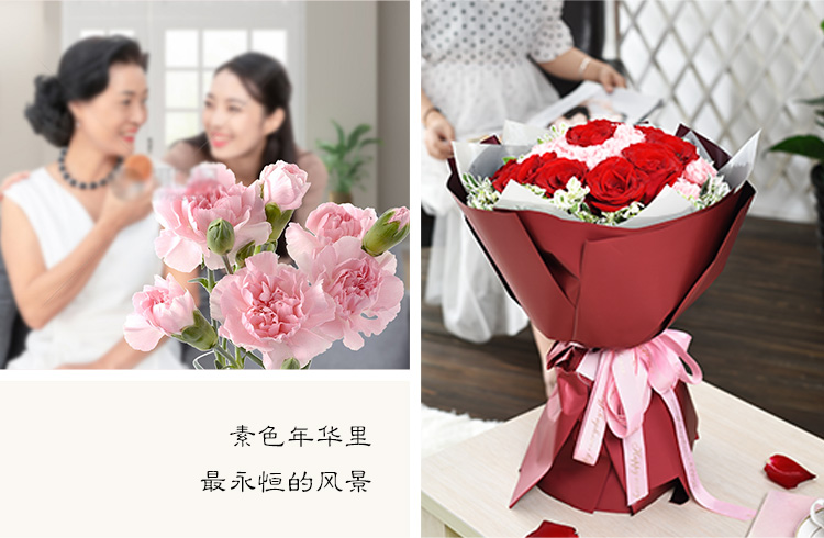 13支粉色康乃馨,9只红玫瑰,叶上花外围