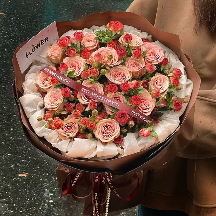 由于花材的季节原因和手工包扎,可能在花束的形式和搭配上与图片不完全一致,但我们保证鲜花的主花材品种、新鲜程度、数量、颜色与说明一致,谢谢。