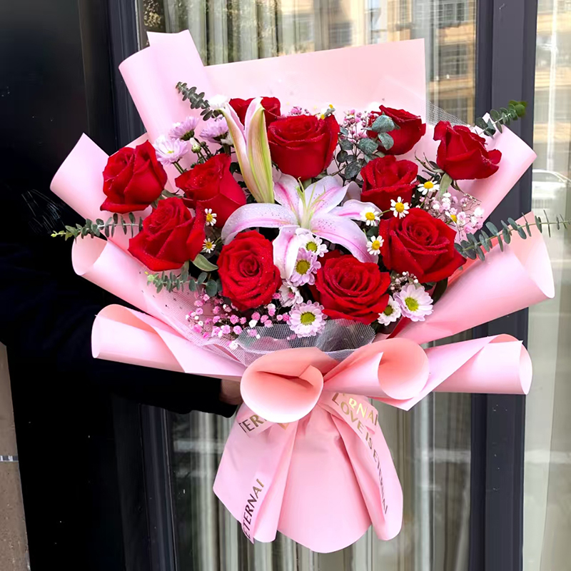 11支红玫瑰,1支多头粉百合,粉色满天星,洋甘菊