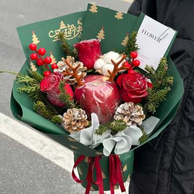 3支红玫瑰 1个带鹿角的红苹果 3颗松果1朵棉花 2支仿真红豆 搭配侧柏诺贝松如图制作