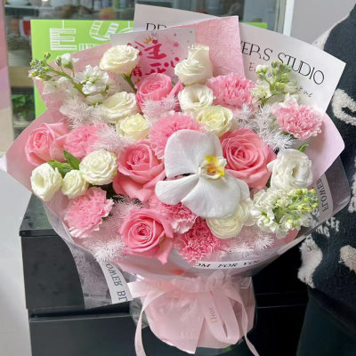 9支粉色康乃馨 5支粉色戴安娜 1支白色蝴蝶兰 4支白玫瑰 3支白色紫罗兰 洋桔梗 白色蓬莱松搭配