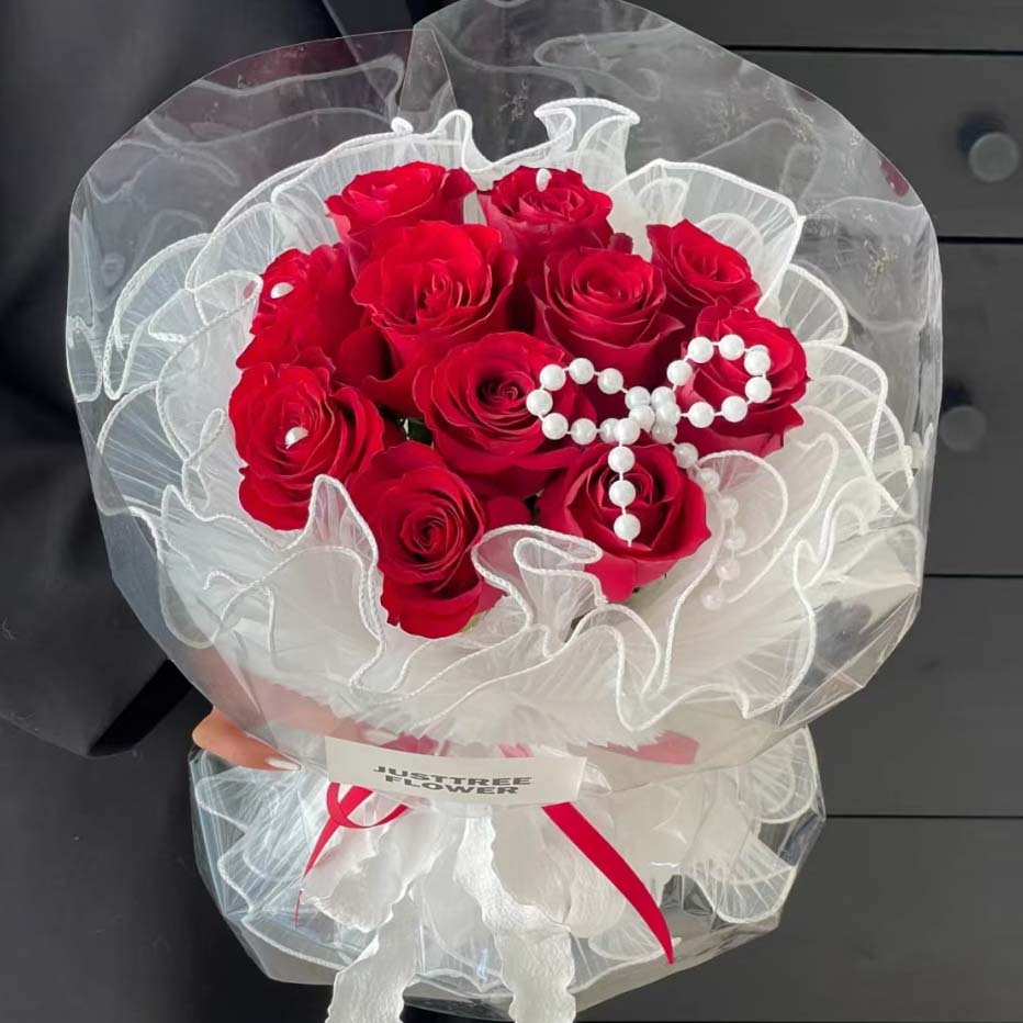 11支红玫瑰 1个珍珠蝴蝶结 珍珠点缀 如图制作