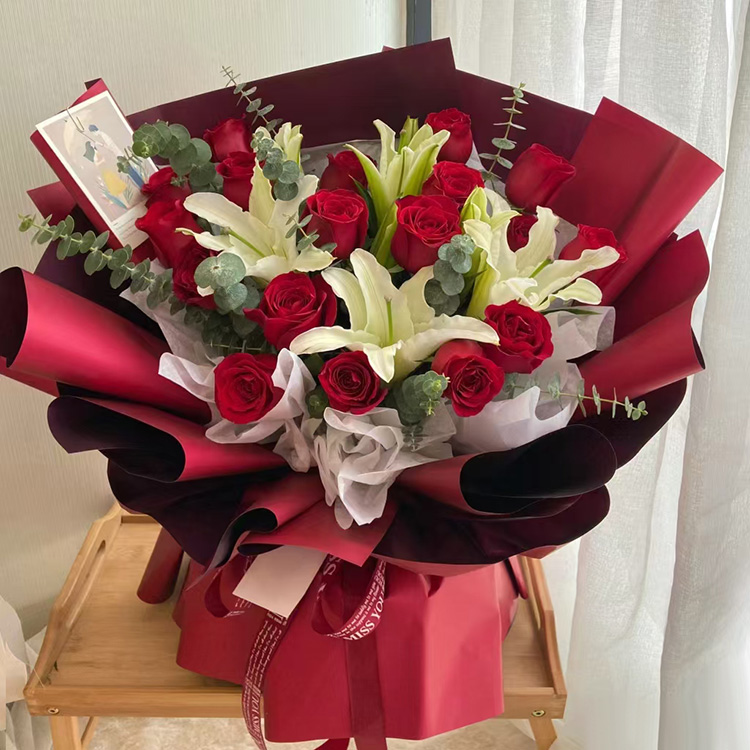 19支红玫瑰,2支多头白百合(至少3头)。尤加利叶搭配饱满