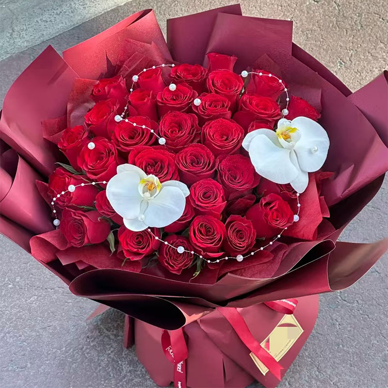 33支精品红玫瑰,2支蝴蝶兰