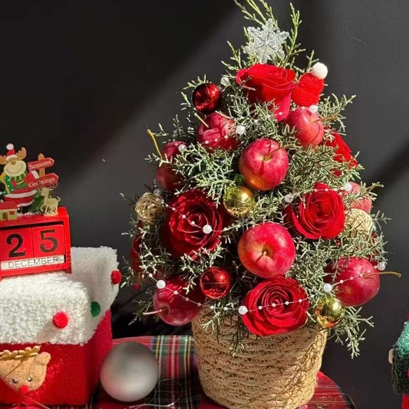 19支红玫瑰 8个苹果 雪花松 珍珠链条 金色小球 红色小球装饰