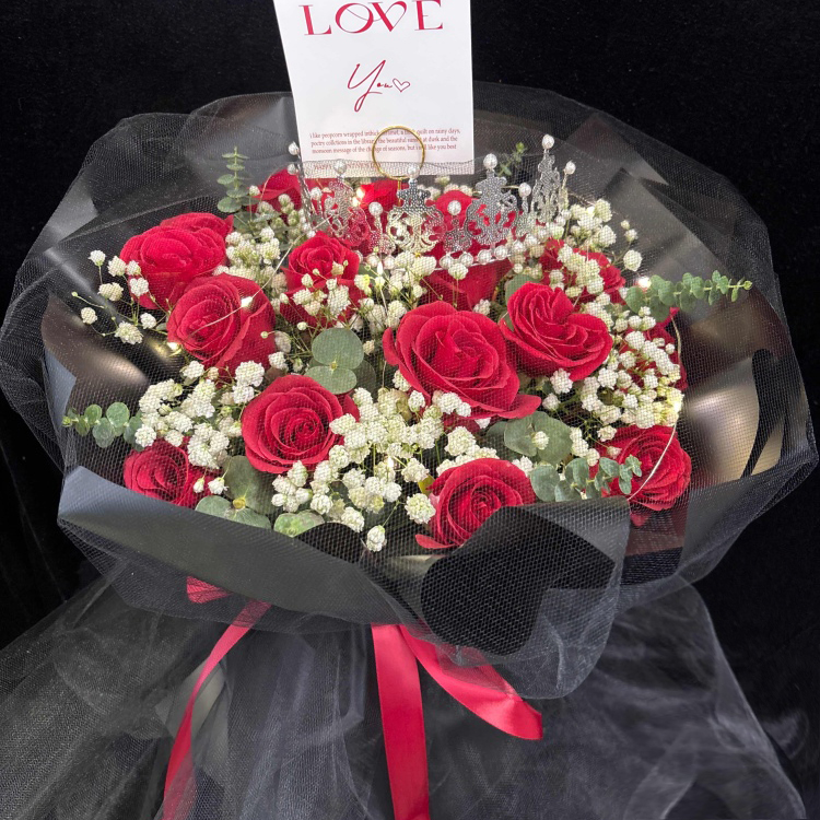 19支精品红玫瑰 搭配白色满天星尤加利叶 1个皇冠 1条灯带 如图制作