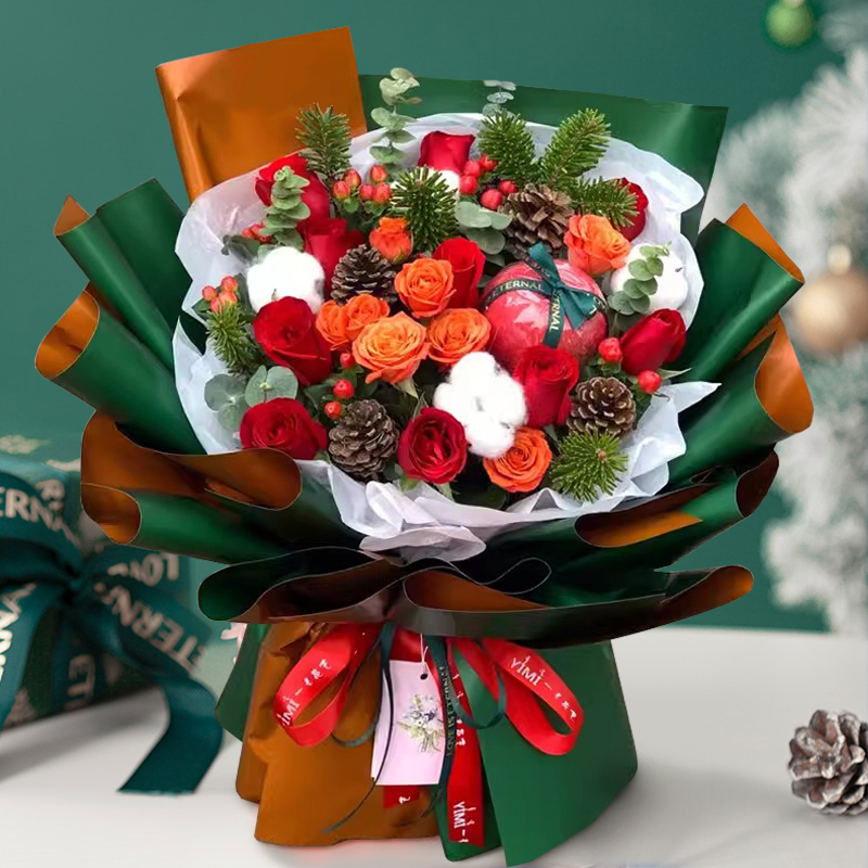 11朵红玫瑰,1个苹果 4支棉花 2支橙色泡泡 4支松果 搭配诺贝松 红豆尤加利叶 如图制作