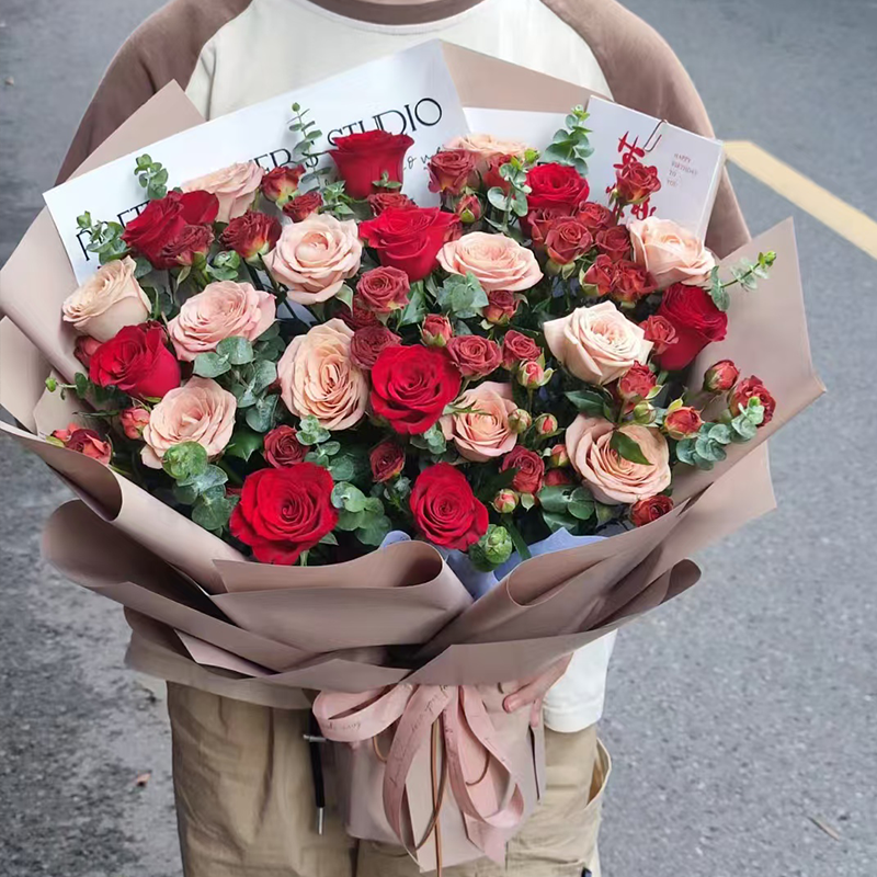 由于花材的季节原因和手工包扎,可能在花束的形式和搭配上与图片不完全一致,但我们保证鲜花的主花材品种、新鲜程度、数量、颜色与说明一致,谢谢。